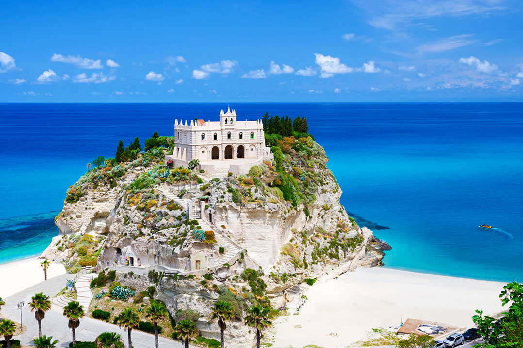 Скалистая местность южного региона Калабрия предлагает отличный выбор пляжных курортов. Живописный берег курортного городка Тропея на берегу Тирренского моря со скалой и церковью Santa Maria dell’ Isola посередине белоснежного песчаного берега превзойдёт все ожидания по красоте и итальянскому колориту. Добраться до места можно из Рима или Неаполя, оттуда ходят поезда (от 25 € / 1800 руб.) и автобусы (от 38 € / 2800 руб. из Рима).