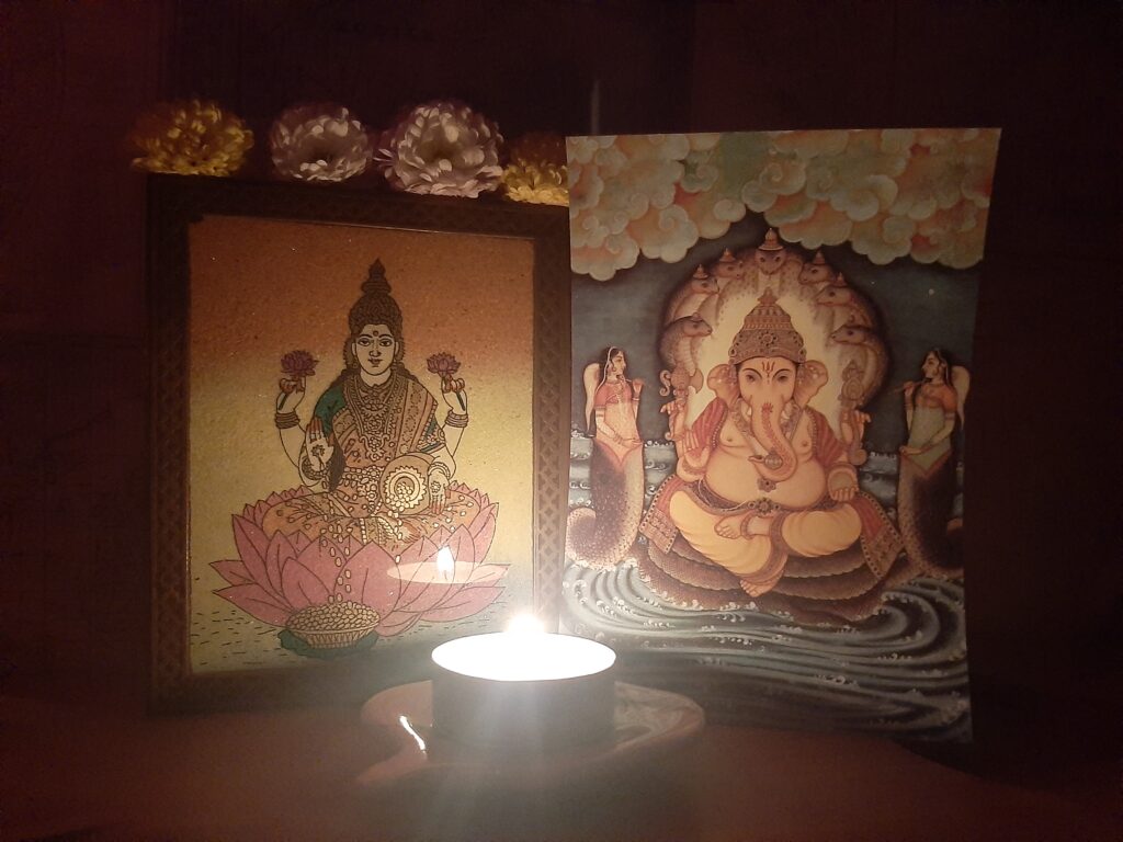 - Ночью проводится пуджа Богине процветания Лакшми и ее приемному сыну Ганеше, часто кроме подношения даров (рис, цветы, сладости, фрукты, сандаловая паста, серебро или золото) и огненного арти, индийцы также ставят перед изображением Богини тхали с монетами в молоке, которые служат залогом обретения удачи и благословения Лакшми.