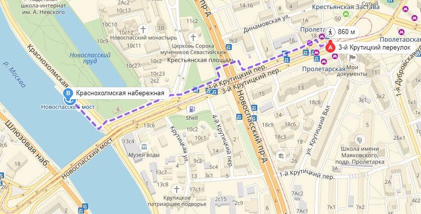 Чтобы попасть к причалу «Новоспасский мост», нужно доехать на метро до ст. «Пролетарская» (Таганско-Краснопресненская ветка) или «Крестьянской заставы» (Люблинская ветка). Поднявшись из подземки, надо пройти Третий Крутицкий пер-к, перейти Новоспасский пр-д и по Саринскому проезду продолжать движение в сторону реки до перекрестка с Краснохолмской набережной. Причал находится в ста метрах справа от перехода. Вся дорога пешком займет не более 10 минут.