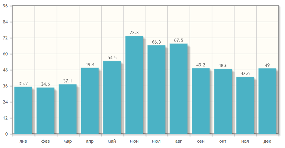 Осадки преимущественно выпадают в виде дождя и приходятся на летние месяцы.