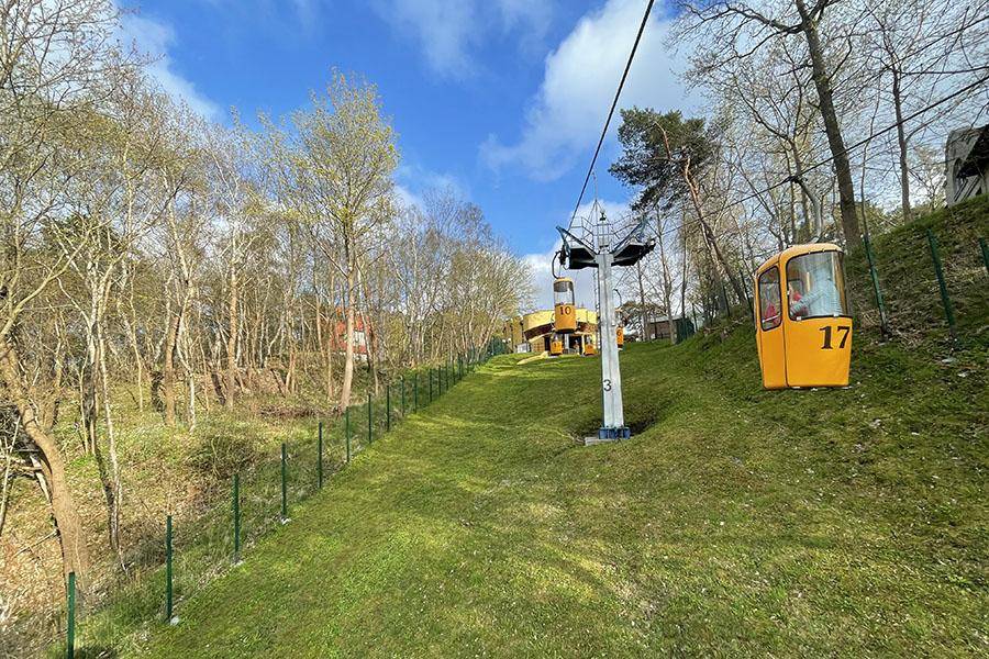Канатная дорога позволяет в считанные минуты добраться от железнодорожной станции к пляжу и набережной. Ярко-желтые ретро-кабинки рассчитаны на двух человек.