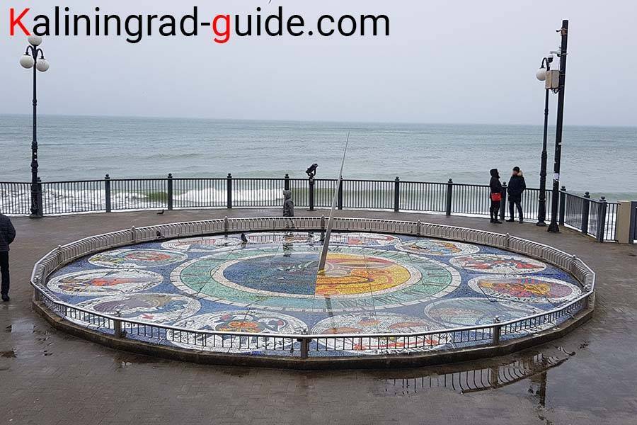 Продолжаем прогулку вдоль моря по променаду, где расположены также солнечные часы «Зодиак» – одна из главных достопримечательностей набережной Светлогорска. Десятиметровый циферблат часов выполнен мозаикой из смальты и украшен знаками зодиака, а угол наклона гномона (стержня, отбрасывающего тень) соответствует географической широте города. Часы были созданы в семидесятые годы и показывают московское время. За высокую точность и оригинальный дизайн часы были внесены в Книгу рекордов Гиннеса.