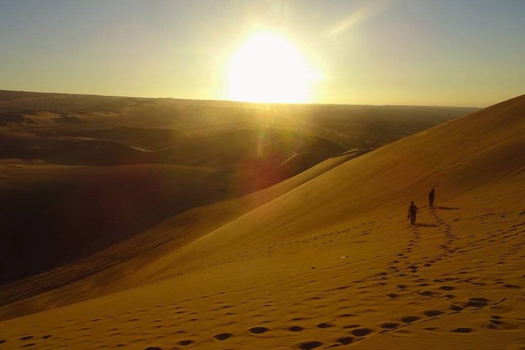 Дюны здесь высокие, как горы. Только покорять их – это вам не в горный поход идти. Во-первых, днем стоит изнуряющая жара. Во-вторых, при малейшем ветерке песок забирается всюду, даже туда, где вы его точно не ожидаете найти. В-третьих, по песку шагать тяжелее, чем по скалам – ноги тонут по щиколотку, постоянно съезжаешь вниз. Эти очевидные неудобства и есть причина того, что на сэндбординг я решила забить и ограничилась покатушками с дюны на попе.
