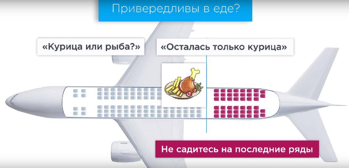 - Выбор питания – уже скудный, так как лучшую еду уже взяли себе пассажиры из носовой части самолета.