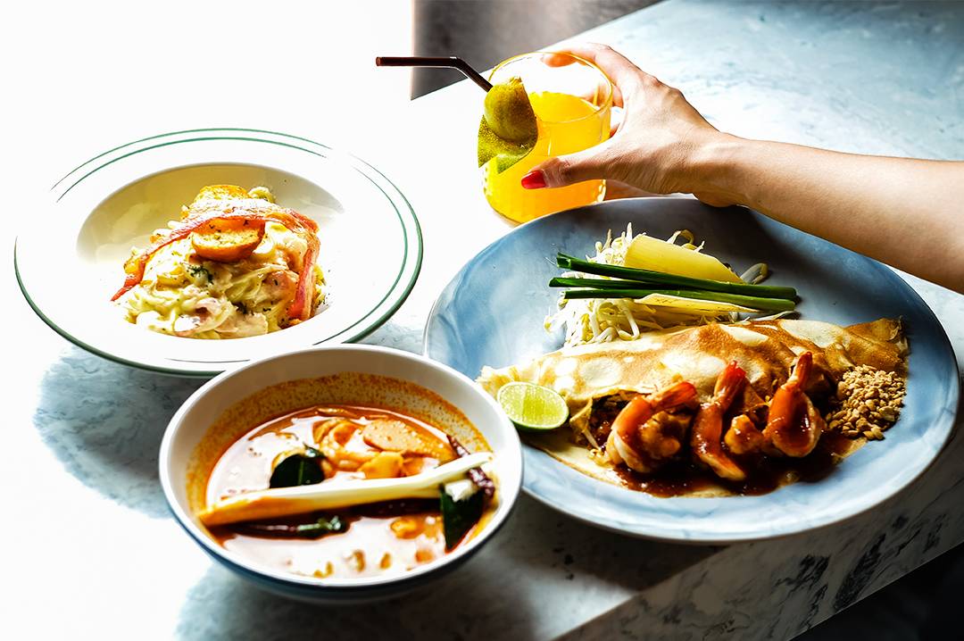 Кислый острый суп том ям или сладковатый том кха на кокосовом молоке, лапша с креветками пад тай или жареный рис, натуральные фруктовые шейки или модные коктейли с панорамным видом.