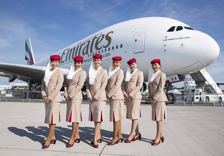 Компания Emirates, изначально созданная для стимулирования туризма в страны Персидского залива, начала свою деятельность в 1985 году с полётов на двух самолётах, взятых в аренду. На сегодняшний день флот Emirates насчитывает более 250 машин, исключительно широкофюзеляжных аэробусов. Полёты осуществляются в 141 пункт назначения на всех континентах. Самолёты Emirates летают даже в Новую Зеландию. В 2016 году был совершён рекордный 16-часовой беспосадочный полёт Дубай – Окленд (16 200 км).