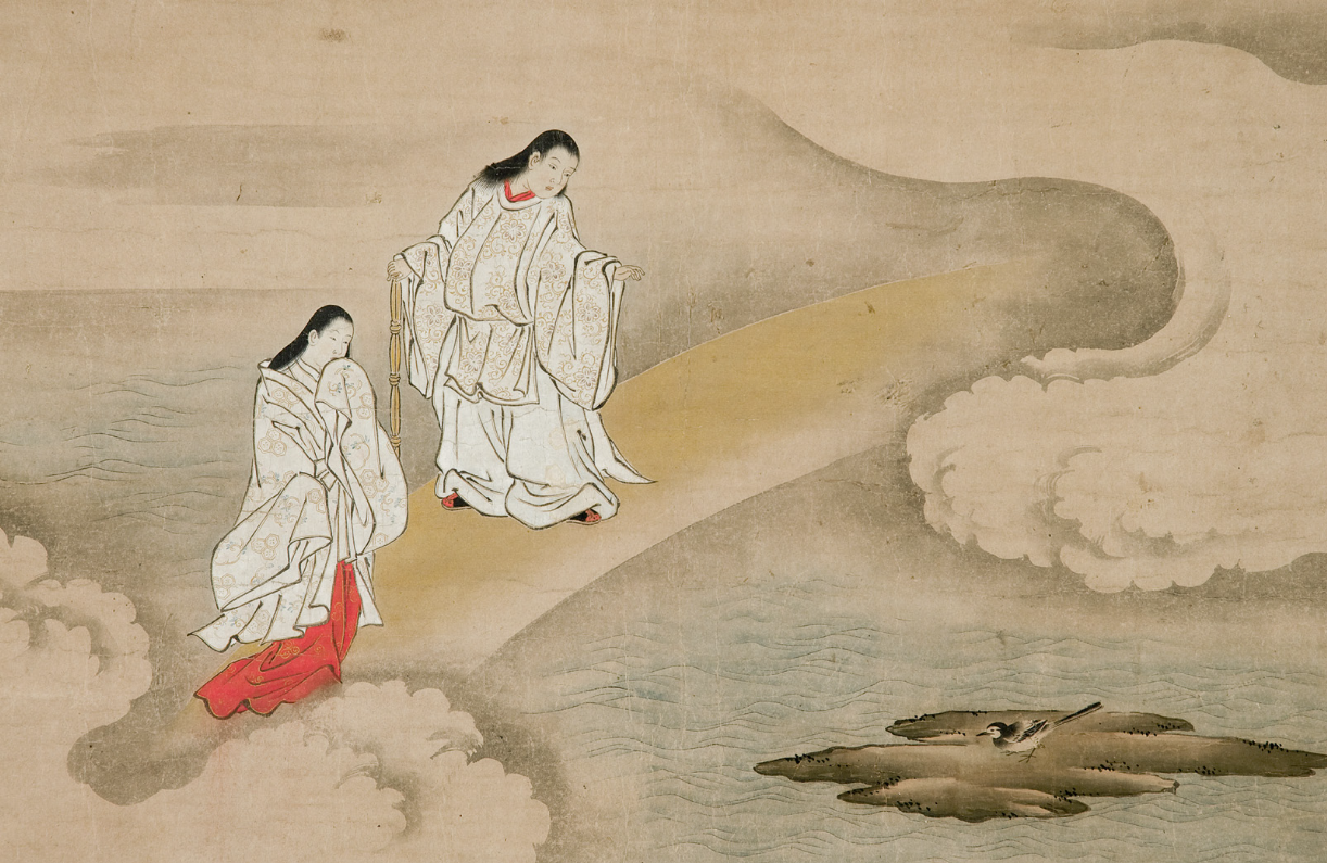 Что касается моста, то легенда гласит, что Идзанаки и Идзанами сначала создали радужный мост (но не такой, как у скандинавов, а именно мост из радуги). Стоя на этом мосту, они поочередно макали в воду свое яшмовое копье. Когда они вынимали его из воды – то с него стекали соленые капли океана, которые и образовали первые на планете острова.