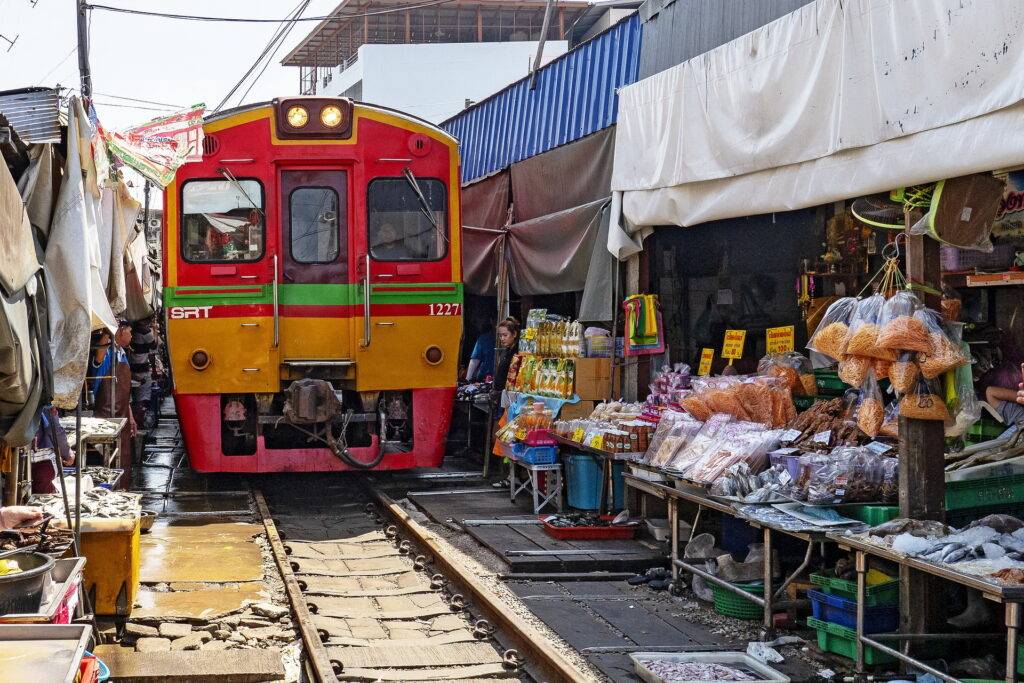 Рынок на железной дороге Mae Klong Railway Market в Самут Сонгкхрам.