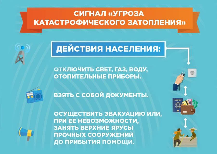 При получении информации об угрозе затопления и об эвакуации безотлагательно, в установленном порядке выходите (выезжайте) из опасной зоны в назначенный безопасный район или на возвышенные участки местности.