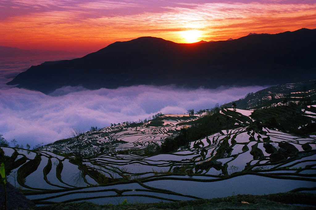 Строительство рисовых террас началось еще в династии Юань (1271—1368). Они являются кульминацией глубокой мудрости и напряженного труда. А какие названия у смотровых площадок вокруг рисовых террас в Китае: «Девять драконов и пять тигров», «Семь звезд вокруг луны»… Здесь их называют «самыми красивыми на свете» и «единственными под облаками».