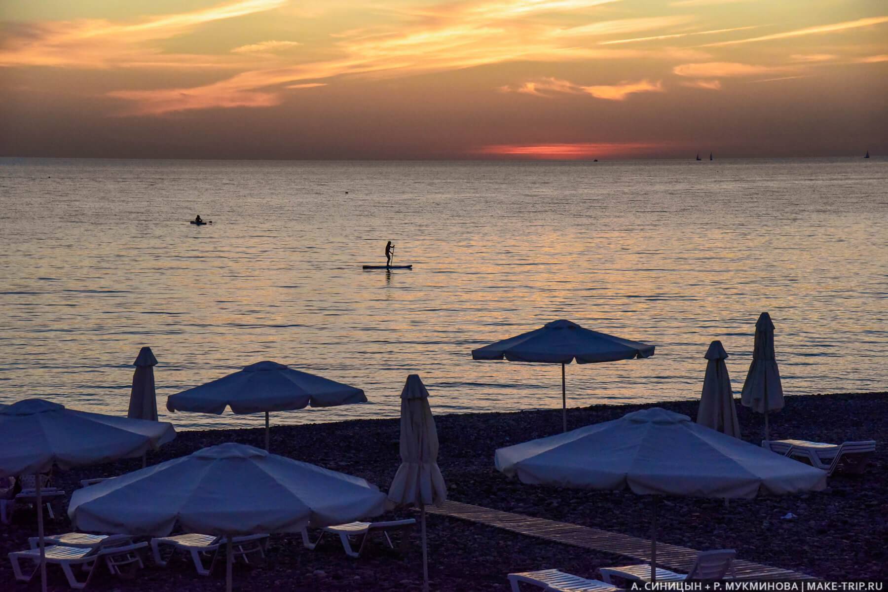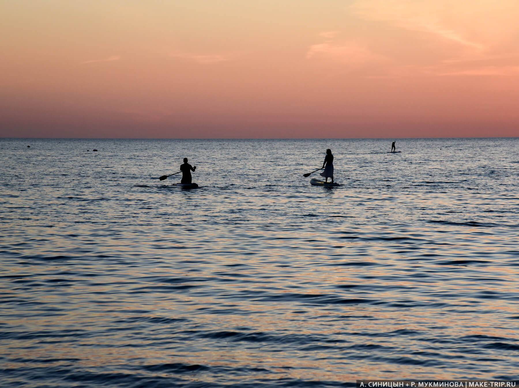 На пляже лежак стоит 300-400 ₽ в день, а шатер — 2500 ₽. Арендовать sup-борд можно за 700 ₽ в час — тут сапы очень популярны.