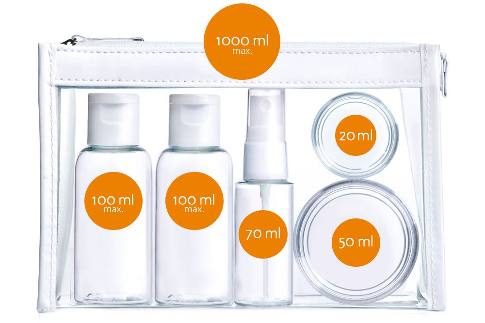 Емкость с данными веществами необходимо поместить в прозрачный пластиковый пакет с молнией объемом до 1 л и размером 18х20 см. Разрешается перевозить только один такой пакет.