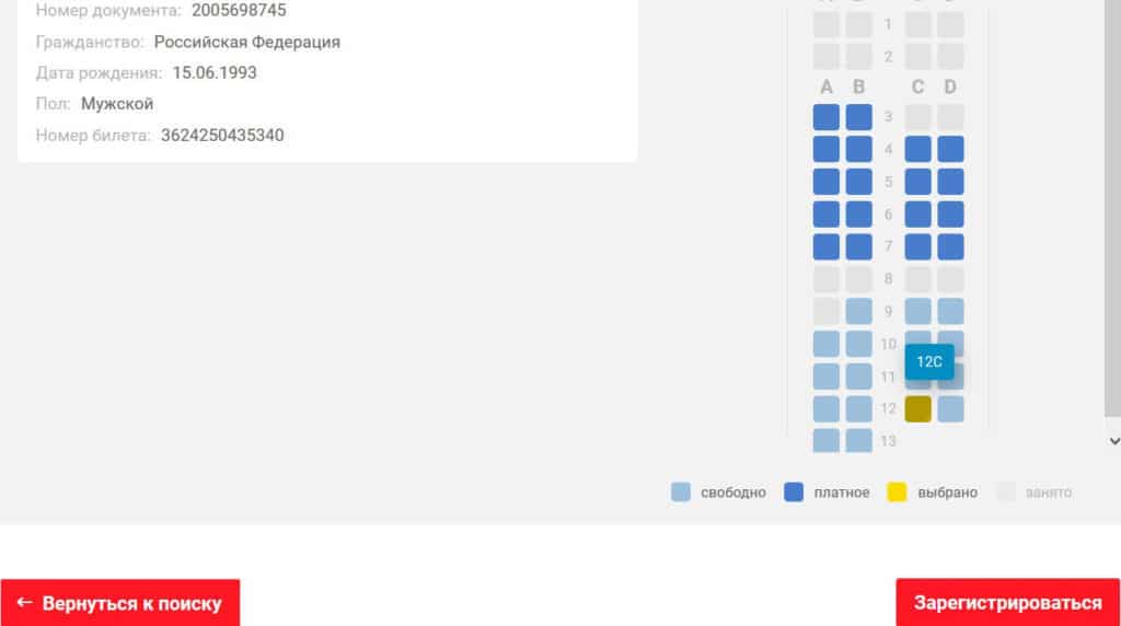 Примечание. Если пассажир выбирает платное место (расположено в начале салона), ему нужно оплатить услугу перед тем, как нажать на кнопку «Зарегистрироваться».