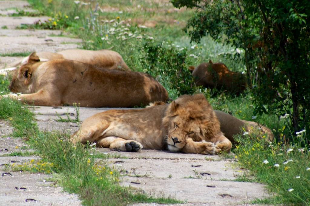 Тут территория в несколько гектар отдана Царю зверей. Львы и львицы вальяжно разгуливают по “саванне” или мирно спят в теньке кустарников. Посетители аппетита у хищников совершенно не вызывают, так как трехразовое обильное питание гарантировано. Некоторое оживление среди жителей искусственной саванны вызывает лишь предвкушение планового обеда.
