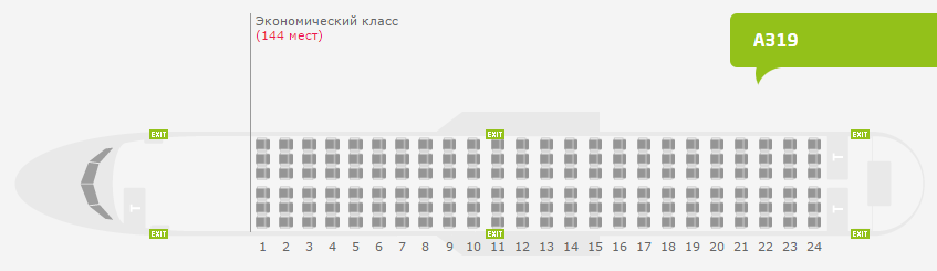 Ознакомимся подробнее со схемой салона, расположением сидений, и определим более и менее комфортные места в Airbus А319.