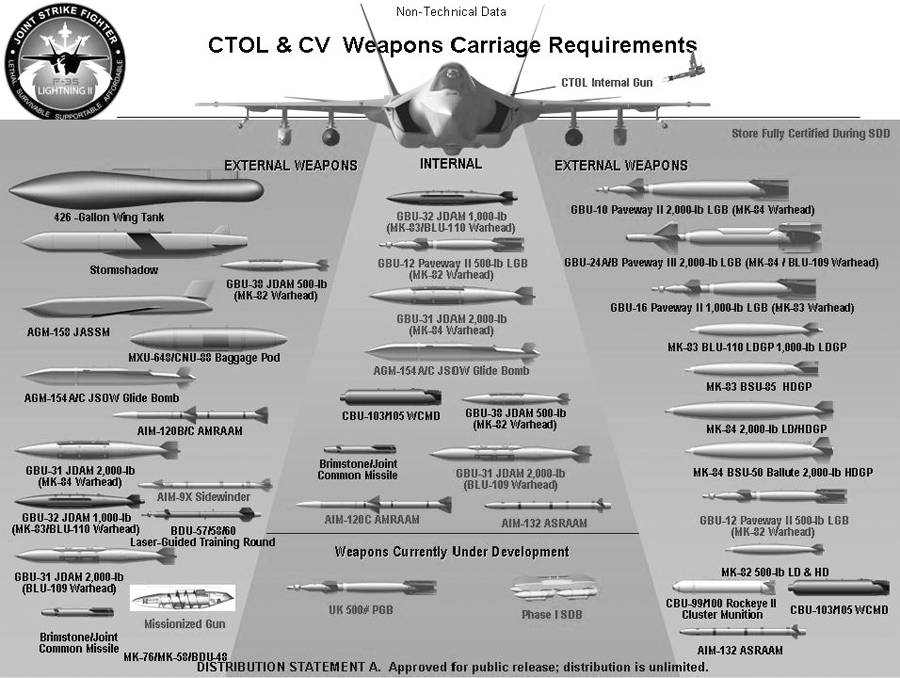 F-35 может использовать широкую номенклатуру вооружения. Все три модификации самолета вооружены автоматической 25-мм пушкой GAU-22/A, которая расположена над левым воздухозаборником. Ее боекомплект составляет 180 снарядов.