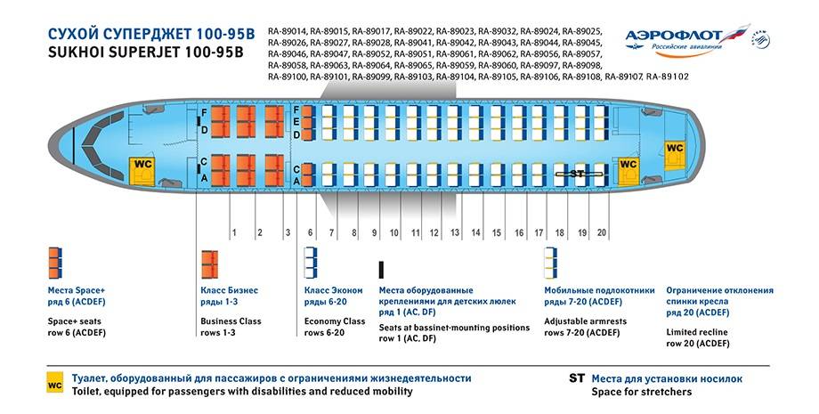 В салоне самолета Sukhoi SuperJet 100 могут разместиться четыре члена экипажа и 98 пассажиров.