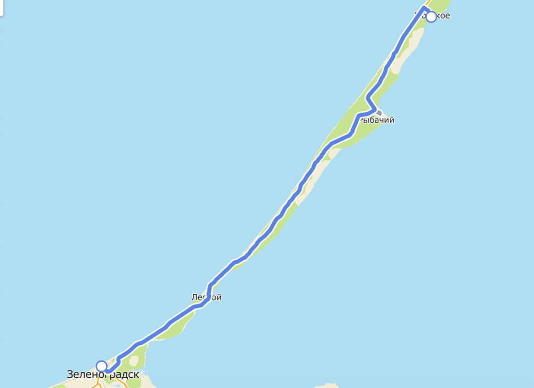 Расстояние из центра Калининграда (площадь Победы) до Куршской косы (контрольно-пропускного пункта) составляет порядка 36 километров.