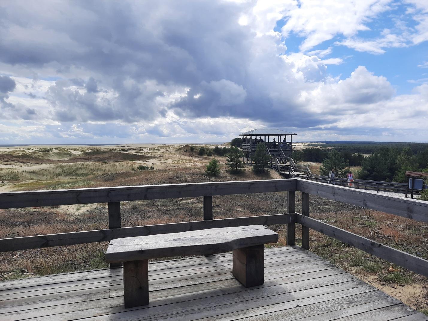 Далее отправляйтесь к “Высоте Эфа”, до нее всего 5 километров. Здесь большая парковка, но в сезон все равно сложно найти свободное место. Припарковавшись, отправляйтесь по маршруту вправо, в сторону Куршского залива. “Высота Эфа”, пожалуй, самый популярный и красивый туристический маршрут Куршской косы с потрясающим видом на открытые дюны. 2.5-километровая прогулка по деревянному настилу под силу практически всем.