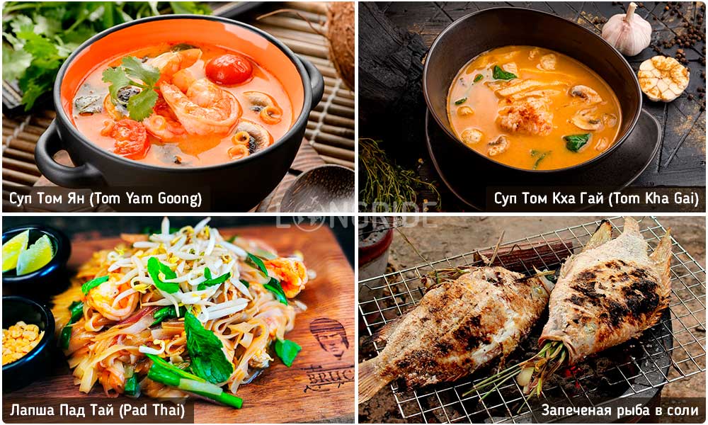 Супы и горячие блюда. Здесь яркими представителями являются супы Том Ям (Tom Yam Goong) и Том Кха Гай (Tom Kha Gai). Последний, кстати, готовится на кокосовом молоке и имеет сладко-острый вкус, хотя бы раз попробовать стоит. Из горячих блюд рекомендуем Пад Тай (Pad Thai) — основное тайское блюдо, в основе которого используется жареная лапша на устричном соусе и ореховом масле, к которой добавляются проростки фасоли, чили, специи и мясо или морепродукты.