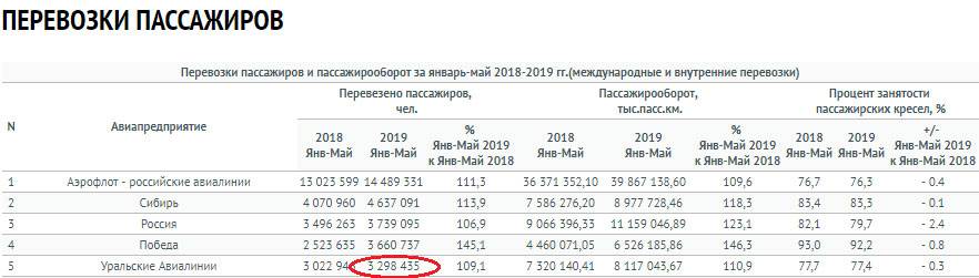 5 место списке крупных авиакомпаний по данным Росавиации