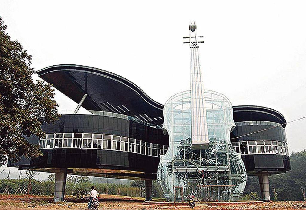 Дом-рояль в Хуайнань – настоящий шедевр оригинального деконструктивизма – построен по проекту китайских студентов как выставочный центр. Огромный «рояль» из черного тонированного стекла крепится на 3 ножках-колоннах. Изогнутая форма здания полностью соответствует линиям рояля.