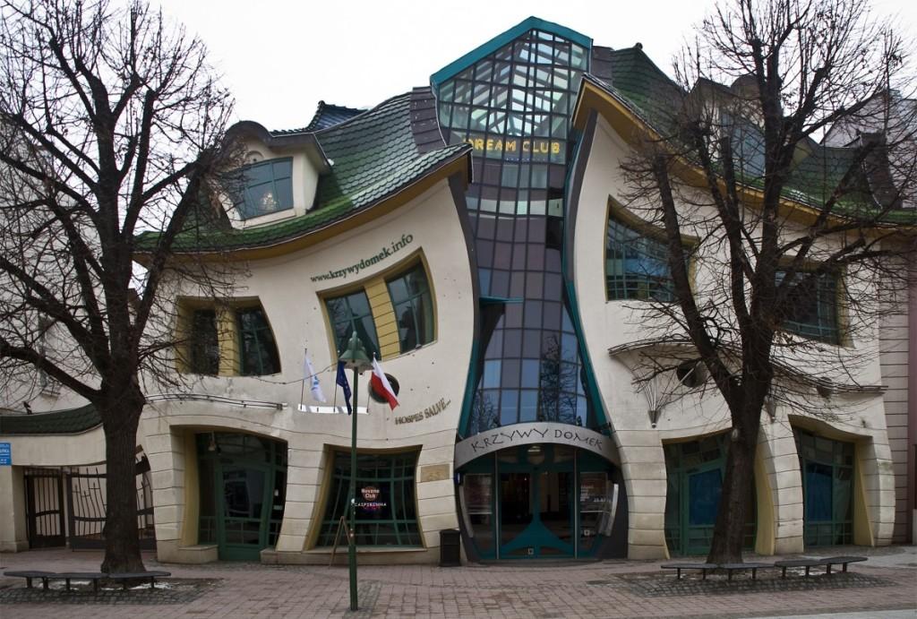 Кривой домик в Сопоте – еще один образец сюрреализма от архитектуры. Вдохновленные модернистскими рисунками Дальберга и Шанцера молодые архитекторы Залевский и Шотинский задумали построить здание необычного вида. В 2004 году на ул. Героев Монте-Кассино в Сопоте вырос Кривой домик, напоминающий персонаж анимационного фильма. Он как будто присел, согнувшись, и не смог разогнуться.