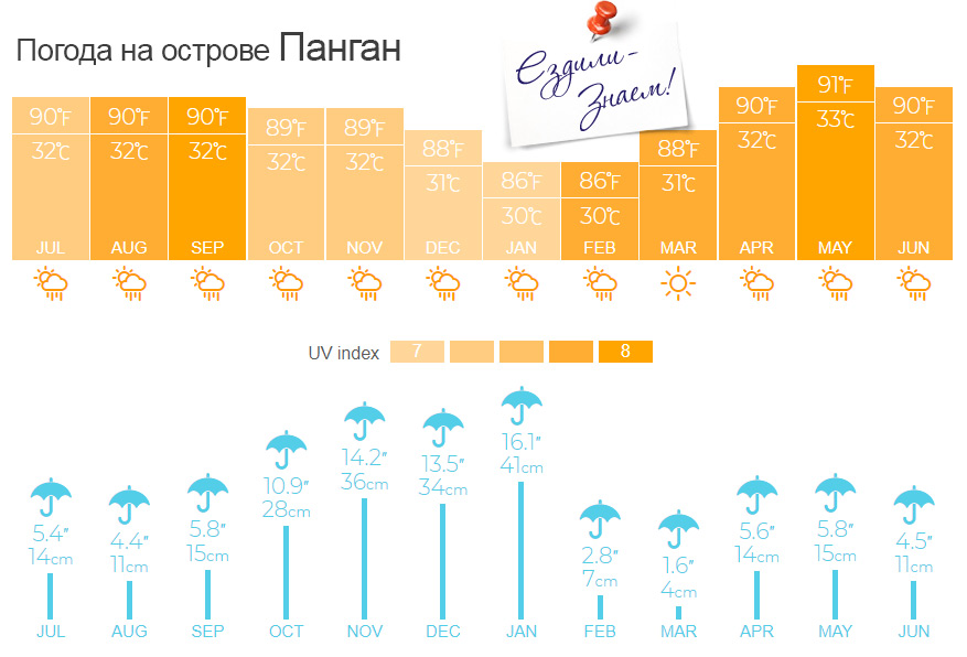 На острове Панган погода почему-то всегда немного лучше, хоть и находятся острова совсем рядом и статистика одинаковая. Но часто бывает, что сидишь на пляже Пангана, смотришь на Самуи, а там – дождь поливает. На Пангане же хорошо и солнечно. Впрочем дождики эти обычно короткие и веселые. А в сезон дождей (с ноября по январь) накрывает все одинаково – и Самуи и Панган и Ко Тао.