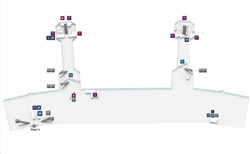 У пассажиров есть возможность принять душ и воспользоваться камерами хранения. Также оба этажа этого крыла имеют медпункт, бизнес-залы, магазины (среди которых и всем знакомый Duty Free). Пассажиров, осуществляющих перелеты только по России должна больше заинтересовать схема аэропорта Домодедово внутренних рейсов. На рисунке она отмечена зелеными цветами. Здесь находится меньше сервисов, но лишь по причине их ненадобности.