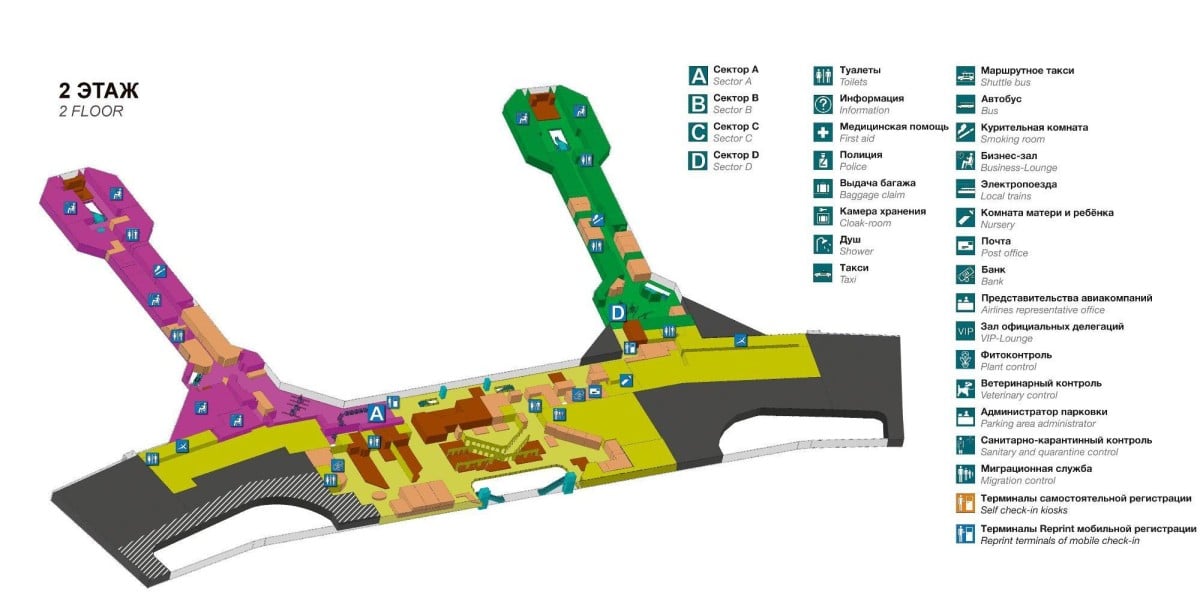 - Терминалы A и D можно найти на втором этаже. Они предназначены для чартерных рейсов с вылетом за рубеж.