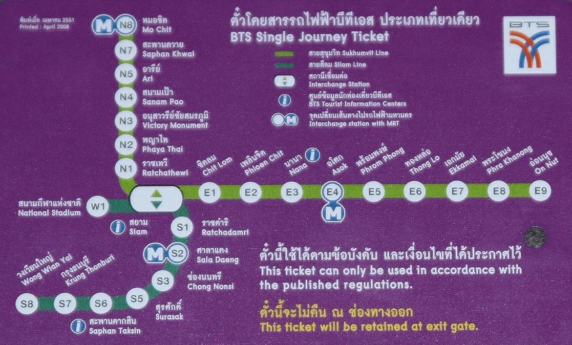 Схема надземного метрополитена простая, интуитивно понятная и обозначена тремя цветами: синим, салатовым, зеленым. Недавно на схеме появилась еще одна линия фиолетового цвета. Наименований станций метро Бангкока обозначается буквой, которая означает сторону света, а также цифрой – расстояние в километрах от центральных районов столицы.