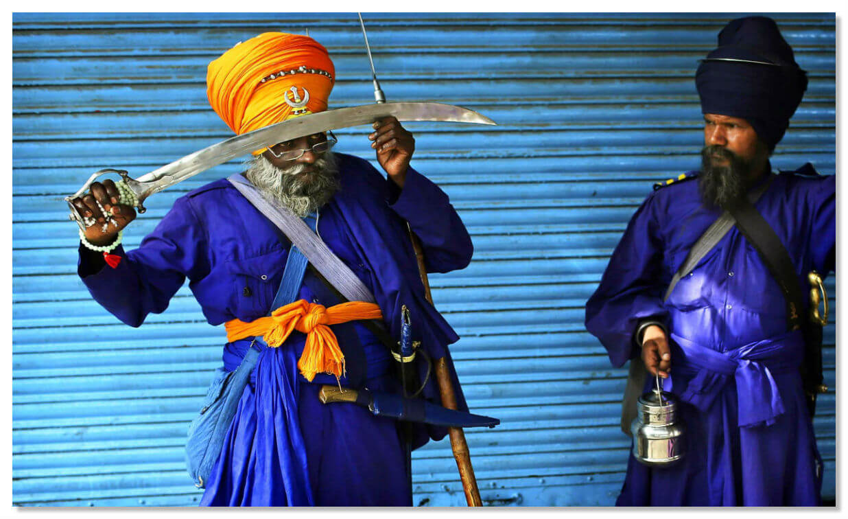 Фрески с подобными надписями можно встретить во многих сикхских храмах. Несмотря на то, что сикхи сами по себе являются чрезмерно воинственными, среди них есть те, кто считается по праву наиболее искушёнными в воинских делах. Речь идёт о нихангах — рыцарский орден внутри сикхской общины. Эти люди добросовестно берегут своё военное искусство, и ещё более ревностно защищают древние знание от иностранцев. Ниханги отличаются особенно огромными тюрбанами, в складках которых часто скрытое оружие, а сам головной убор украшают чакры — металлические кольца, которые используются как холодное метательное оружие. Им запрещено стричься и бриться, традиционными для них являются синие и жёлтые цвета.