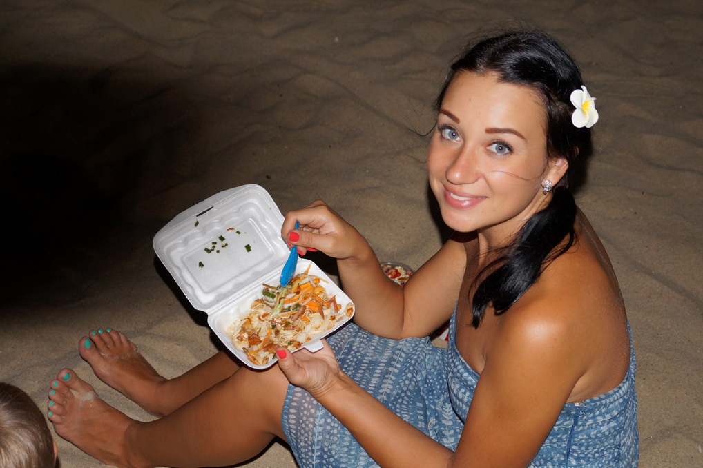 А еще во Вьетнаме можно купить вкусную еду в уличных кафешечках, взять ее с собой и поужинать на пляже: