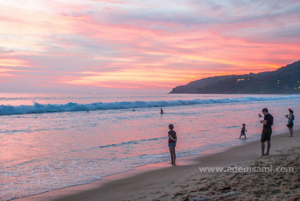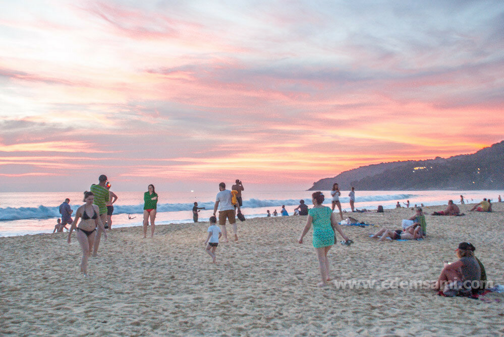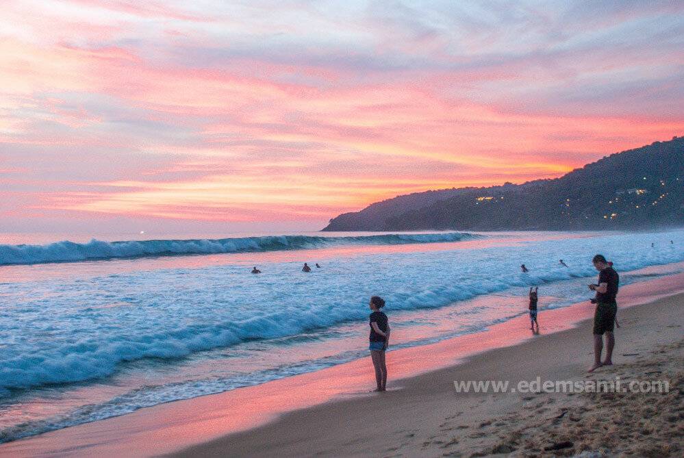 В общем, могу, наверное, сказать, что Карон мне понравился меньше всего из всех основных пляжей Пхукета; зато и самый выразительный закат у нас тоже случился на Кароне. Во-первых, видимо, повезло с самим закатом: он было чисто розовый – я давно таких не видела. Во-вторых, к моменту заката на пляже собралось очень много народа. Кто-то расположился с пикником, кто-то просто сидел на берегу и медитировал – но как бы то ни было, ощущения от такой массовой встречи заката совершенно непередаваемые. Одно из самых красивых воспоминаний с Пхукета. Смотреть, как немного пасмурный день постепенно превращается в розовую феерию вечера, – бесценно.