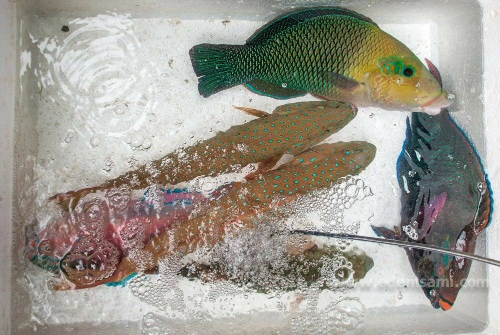Что в ящике? Сверху губан. Справа попугай, в горошек груперы, между ними еще попугай, внизу посередине еще кто-то. Не имей 100 рублей, а имей друзей-дайверов, как говорится.