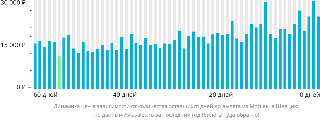 Посмотрите, как менялась цена на авиабилеты из Москвы в Швецию в зависимости от времени покупки. С начала продаж их стоимость меняется в среднем на 53%. Минимальная цена по направлению из Москвы в Швецию — за 54 дня до вылета , примерно 11 108 рублей . Максимальная цена по направлению из Москвы в Швецию — за 1 день до вылета , примерно 29 478 рублей . В большинстве случаев раннее бронирование помогает сэкономить, воспользуйтесь этим!