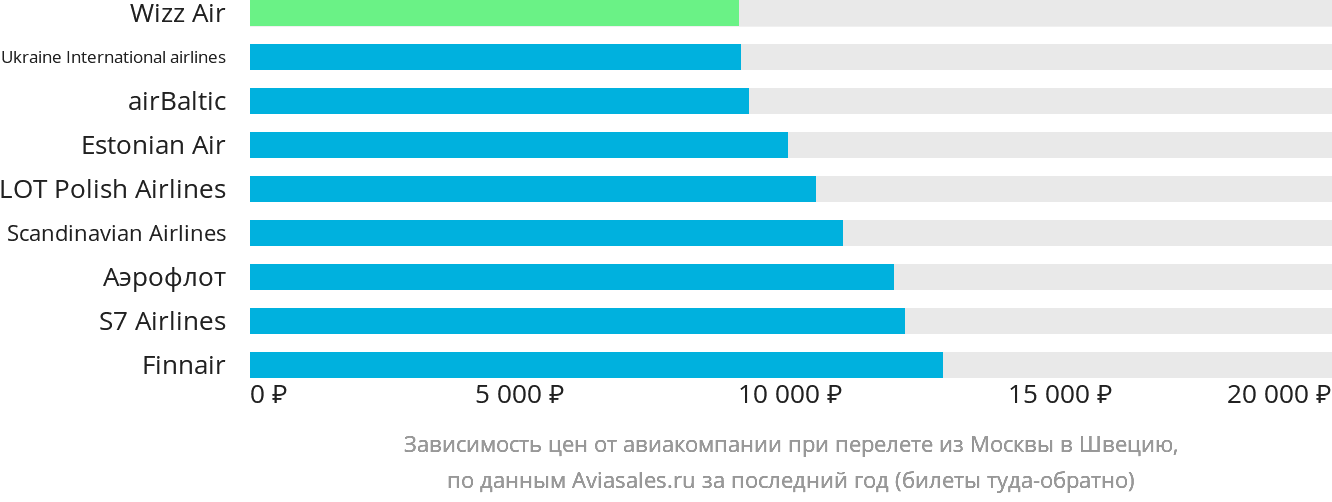 Статистика поможет выбрать рейс, ориентируясь на свои финансовые возможности, а также пожелания в плане комфорта и условий перелёта. Наиболее низкие цены на авиабилеты из Москвы в Швецию предлагает Wizz Air, самые высокие цены — Finnair.