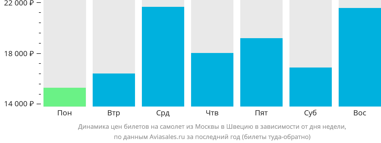 По статистике, самый доступный вариант рейсов из Москвы в Швецию — по понедельникам, их средняя стоимость — 15 380 рублей . Наиболее дорогие рейсы — по средам, их средняя стоимость — 21 459 рублей . Стоит учесть, что вылеты в предпраздничные дни, как правило, дороже. Мы надеемся, что эти данные помогут вам наиболее эффективно планировать свои путешествия.