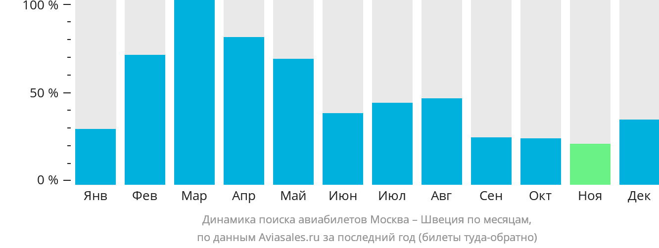В период высокого спроса рекомендуется приобретать авиабилеты из Москвы в Швецию заранее. Например, число поисковых запросов в марте достигает максимума в 16059 запросов , а в ноябре их количество снижается до 22 от максимума.