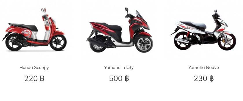 - Honda Scoopy – 220 бат/день; 880 бат/неделя; 2100 бат/30 дней.