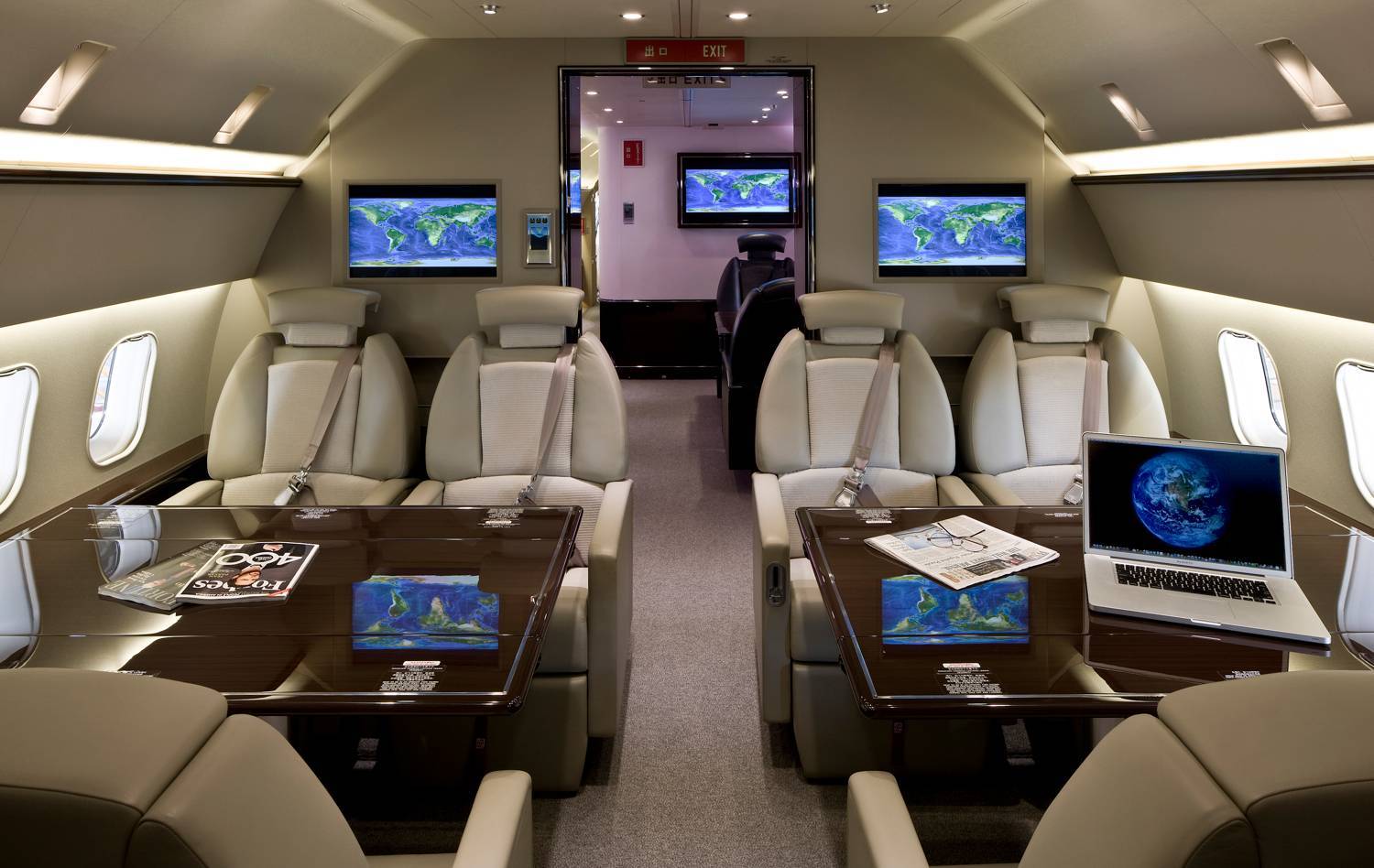 - Bombardier Global 6000: дальность полёта — 11 112 км, количество мест — 13–19, скорость — 943 км/ч, самый большой размер салона среди остальных бизнес-джетов, три секции, бортовая кухня, санузел;