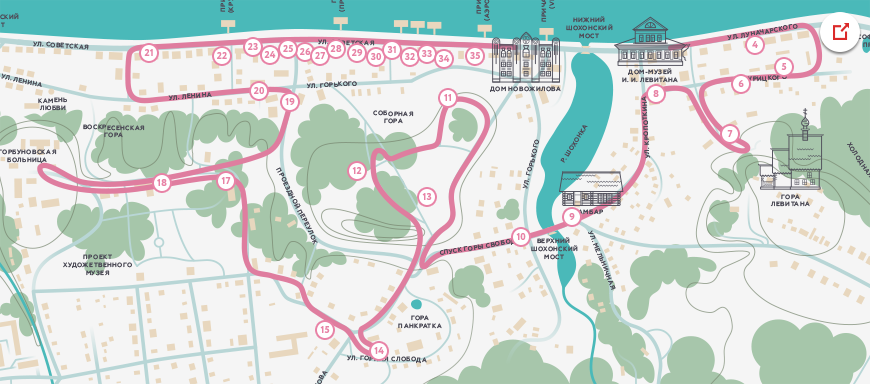 Далее маршрут ведет вверх — на Левитановскую горку. Первая достопримечательность на Варваринской улице — Варваринская церковь, построенная в 1821 году. Церковь примечательна слегка наклоненной колокольней — угол наклона равен 10 градусам. Далее идет подъем по деревянной лестнице с 162 ступеньками. Наверху установлен памятник Левитану — живописец изображен в процессе написания пейзажа. На этом месте была написана картина «Над тихой обителью» — вы можете увидеть копию деревянной церкви с картины (оригинальная сгорела в 1904 году).