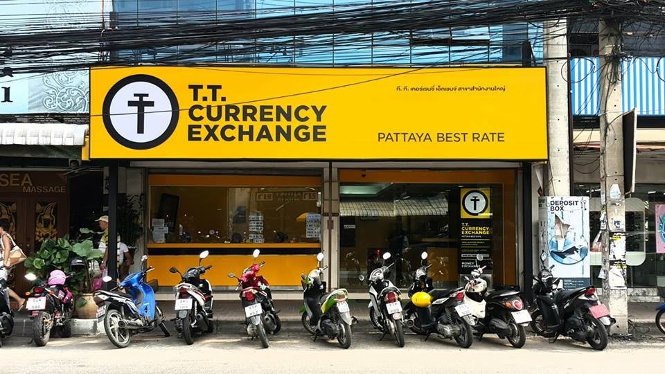 В Паттайе есть целая сеть обменных пунктов валюты с выгодными курсами. Называется она T.T. Currency Exchange, крупные отделения сети внешне выглядят, как на фото выше. Ряд обменников этой сети меньше, размером с ларек. Отличаются фирменным желтым цветом оформления. Работают ежедневно с 9 утра до 11 вечера. Есть на Джомтьене, на Beach Road (в том числе рядом со входом на Walking Street), Second Road, на Сой Буакао и в Северной Паттайе. Обменник-киоск выглядит так: