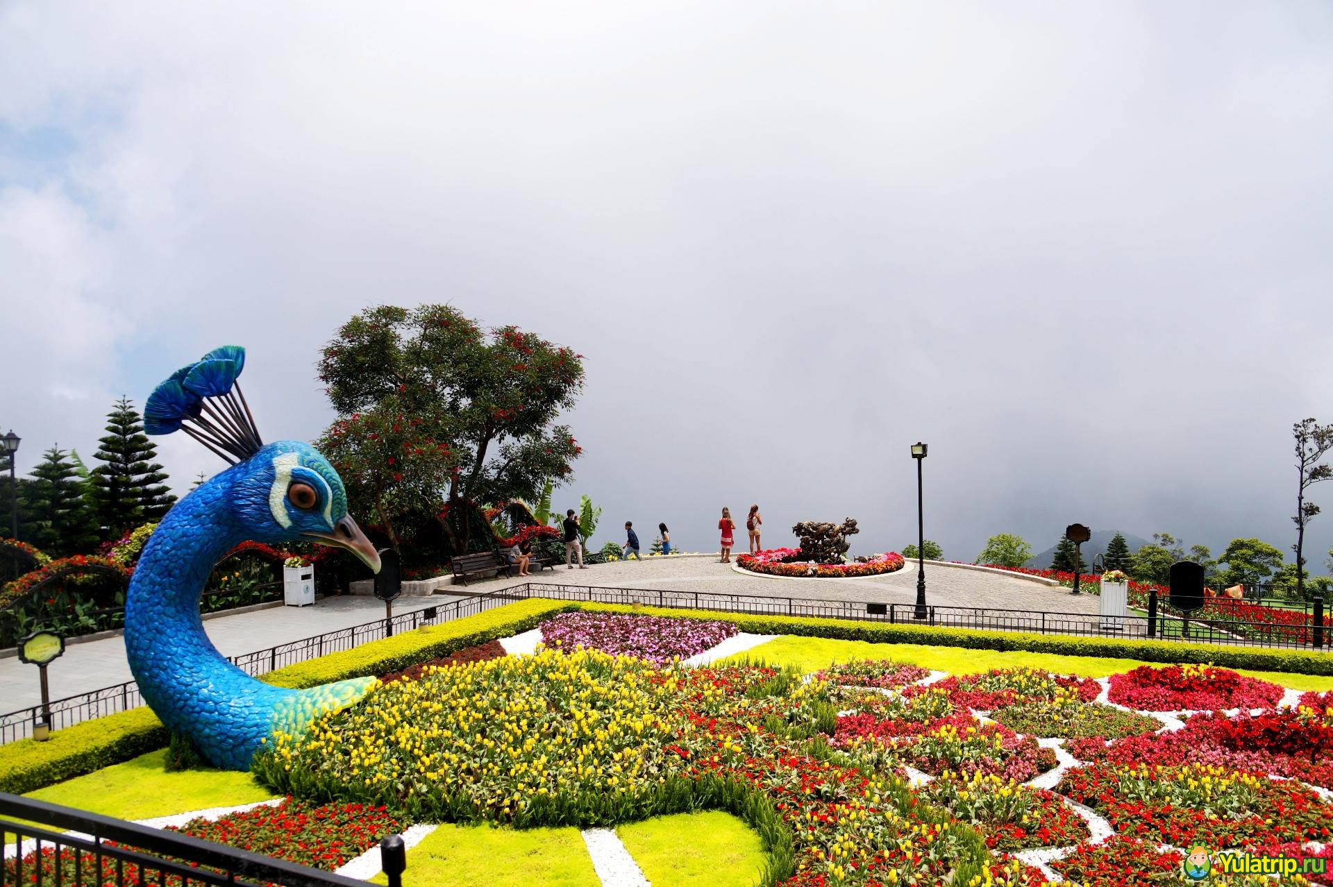 В центре всей этой красоты мы увидели фигуру павлина с хвостом, сделанным из посаженных цветов — очень-очень красиво! Тут же набежали облака, и те люди, которые стояли у края, казалось стоят у края обрыва. Сверху смотреть на всю эту красоту было необычайно здорово. Я спустилась к так называемому обрыву, но обрыва там не было, а лишь еще одна площадка, усаженная цветами спускалась вниз.