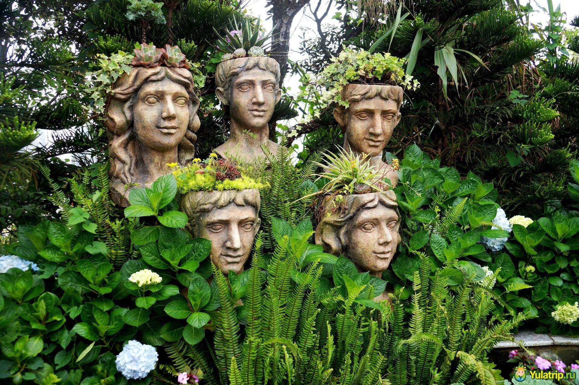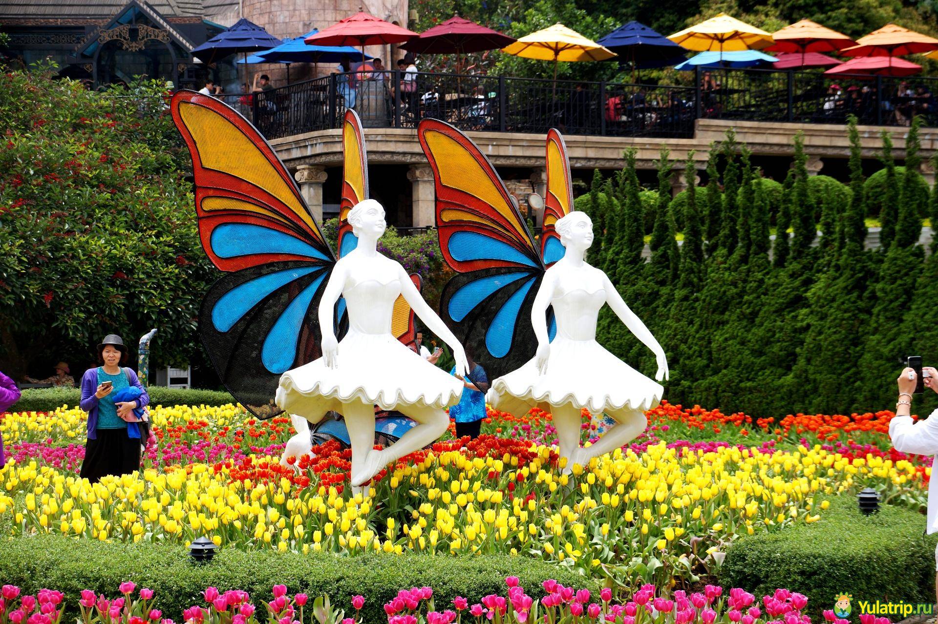 Наверху, в самом начале парка цветов в центре находятся фигуры двух балерин.