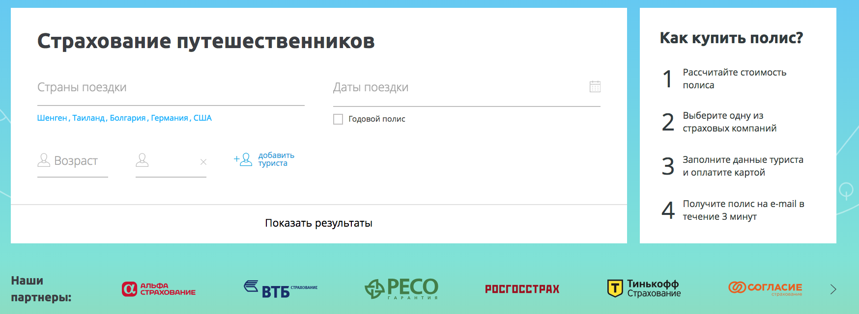 Пример формы, которую нужно заполнить, чтобы получить варианты страхового полиса. Указываешь страну, даты поездки и возраст путешественников. Всё просто.