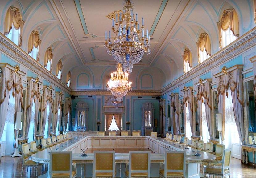 Голубой зал — самый большой зал дворца и самый торжественный: мраморные камины в стиле барокко, зеркала, позолота. В его стенах организуют государственные приемы и конференции, а также концерты классической музыки и светские приемы.