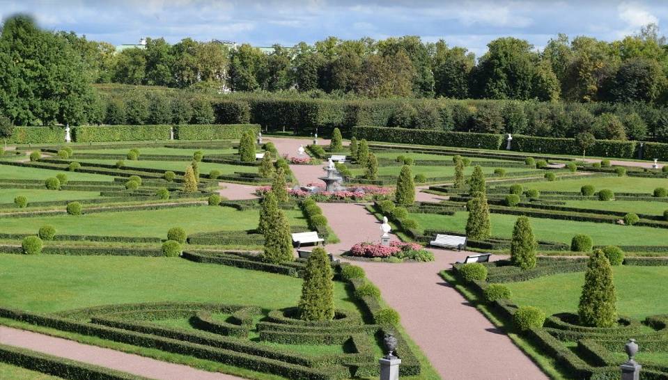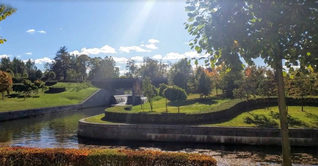 Константиновский парк — настоящее произведение искусства. Всё здесь сделано идеально: зелёные лужайки повторяют геометрические фигуры и отделяются друг от друга безупречно ровными аллеями, образуя симметричные узоры. Цветущие клумбы вносят красочные штрихи в общую картину, а скульптуры, каменные вазы и изящные фонтаны завершают композицию.