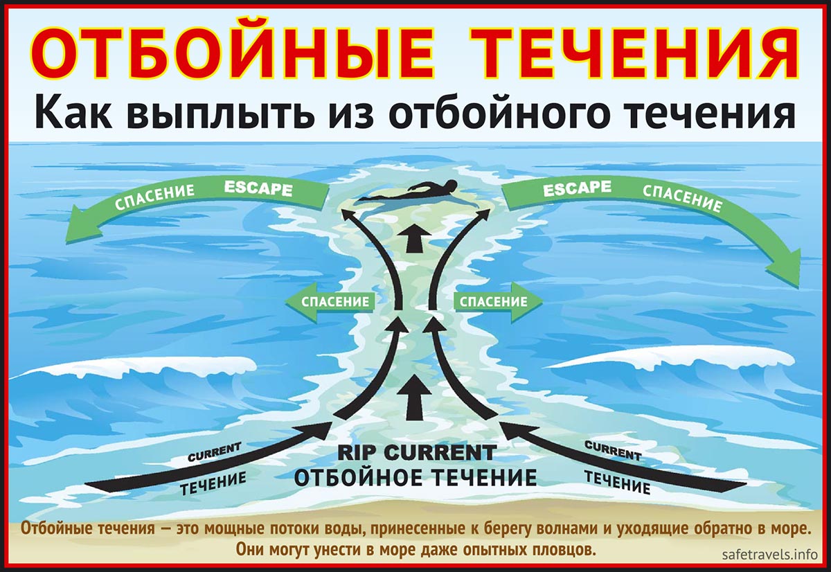 Отбойные течения возникают именно у берега. Поэтому если вы не умеете плавать не стойте у берега в одиночку и ни когда не игнорируйте предупреждающие знаки.