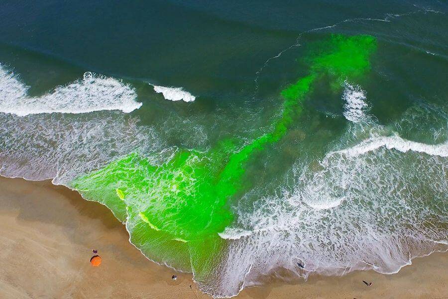 • такое явление обозначается изменением цвета воды на более мутный, тогда как остальное море или океан зелёно-голубое;